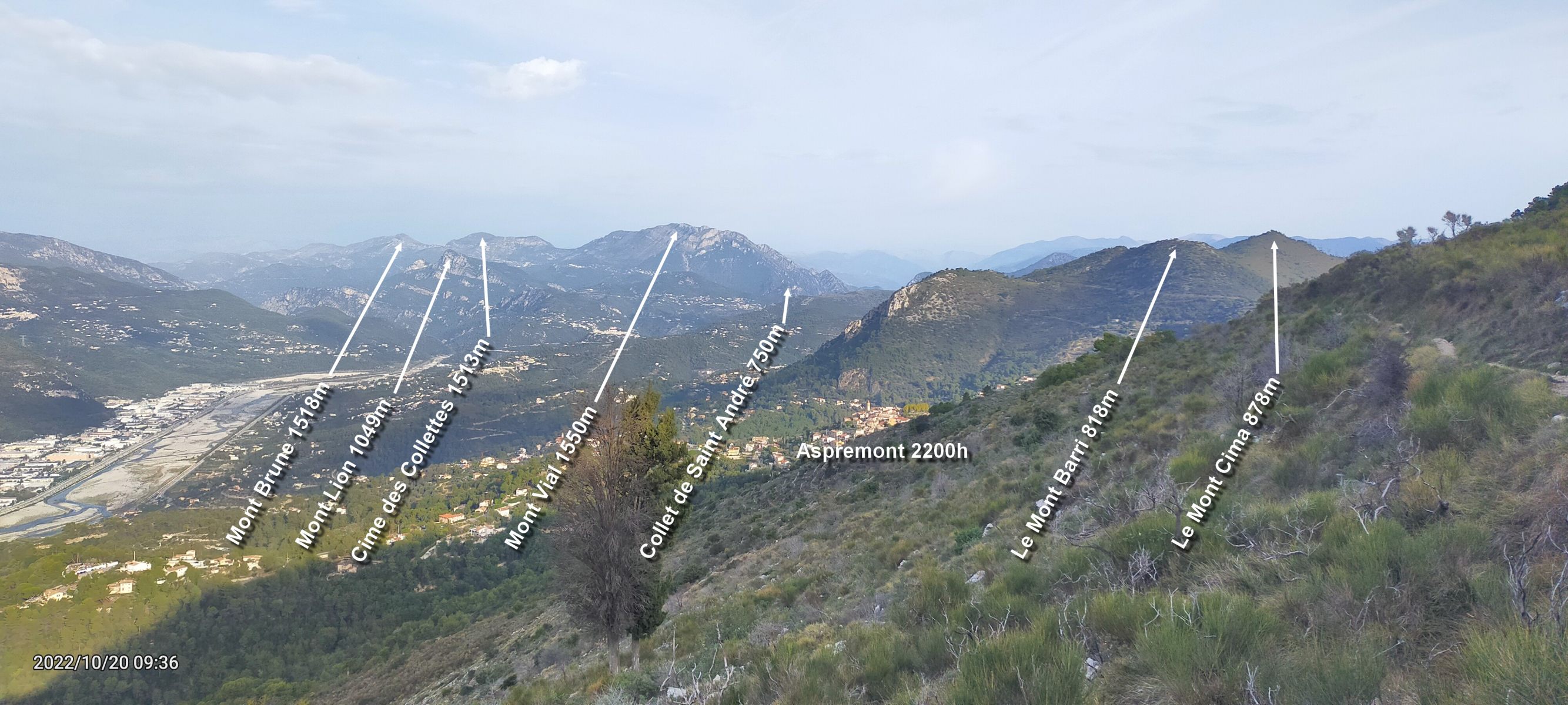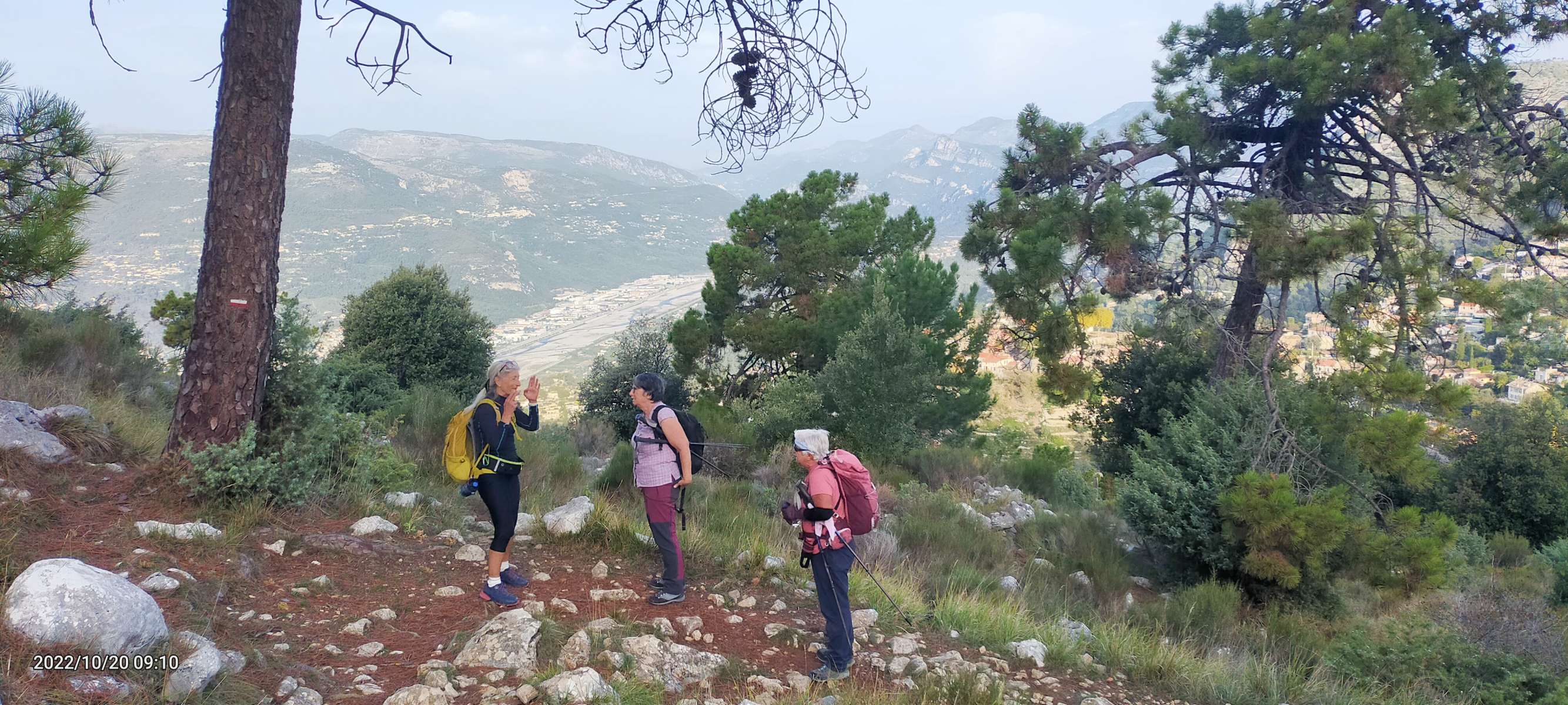 Le Mont Chauve 855m Les randonnées de ce mardi ayant été très "lonnnnggguue" comme dit Alain la randonnée de ce jeudi avait été prévue courte et proche(carburant oblige) et donc 4 randonneurs seulement se retrouvent au parking de Castagniers Il y a de la place au parking des tennis 490m , nous regardons passer les bus scolaires. Le départ grimpe bien mais ça se calme ensuite et nous pouvons admirer la vallée du Var et les sommets de l'Ouest Arrivés au croisement des chemins nous prenons les zigs et les zags de la piste qui nous mènent jusqu'à la porte du fort (850m) dont nous escaladons les remparts. Le paysage est sûrement très beau mais très embrumé. Le fort est maintenant coiffé d'un immense miroir circulaire qui sert d'écho radar pour les avions. Nous redescendons pour longer le fort sur la droite, le cheminement est encombré par des épineux qui ont bien poussé depuis notre équipée de 2019. Nous arrivons aux escaliers qui montent aux grillages toujours percés par le trou des randonneurs. Il est encore tôt et nous décidons de descendre à la baisse de Guiguo. Repas et discussions animées dans l'herbe verte. Le chemin de descente est apparemment un itinéraire apprécié par les VTTistes et en conséquence les cailloux y sont assez roulants, c'est moins agréable pour les randonneurs. Le Café-Brasserie-Tabac-Loto du centre ville nous accueille agréablement sur sa terrasse. Randonnée ensoleillée courte et très agréable. Jean-Paul |