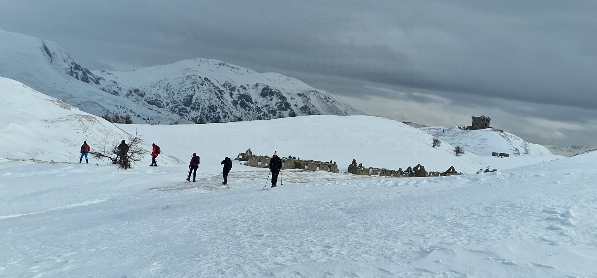 Les 9 randonneurs étaient perplexes en arrivant au Camp d’Argent... Sur la route vers le parc, la neige était gelée, le noir apparaissait parfois… Et le vent se mit à souffler… La crête de l’Authion, dont les pentes sud étaient déneigées, était cependant raquettable, malgré le vent cinglant transportait quelques cristaux de neige. Un rapide aller-retour venté à la pointe des Trois communes, puis nous plongeons dans le vallon, à l’abri du vent. Lequel se calme finalement. Et le soleil qui se fait moins timide ! Et la neige qui est excellente. Nous atteignons la Giagiabella sous un soleil radieux. Surprise ! Cricri nous a apporté la galette-frangipane, et… de quoi la réchauffer, car les frangipanes sont meilleures chaudes : camping-gaz, poêle à frire, … Merci Criri ! Et bravo à la cuisinière ! Nous rejoignons ensuite le long chemin du retour, bien enneigé et ensoleillé. Bilan : 530 m / 13,2 km. Une première sortie raquettes réussie. Michel. PHOTOS |