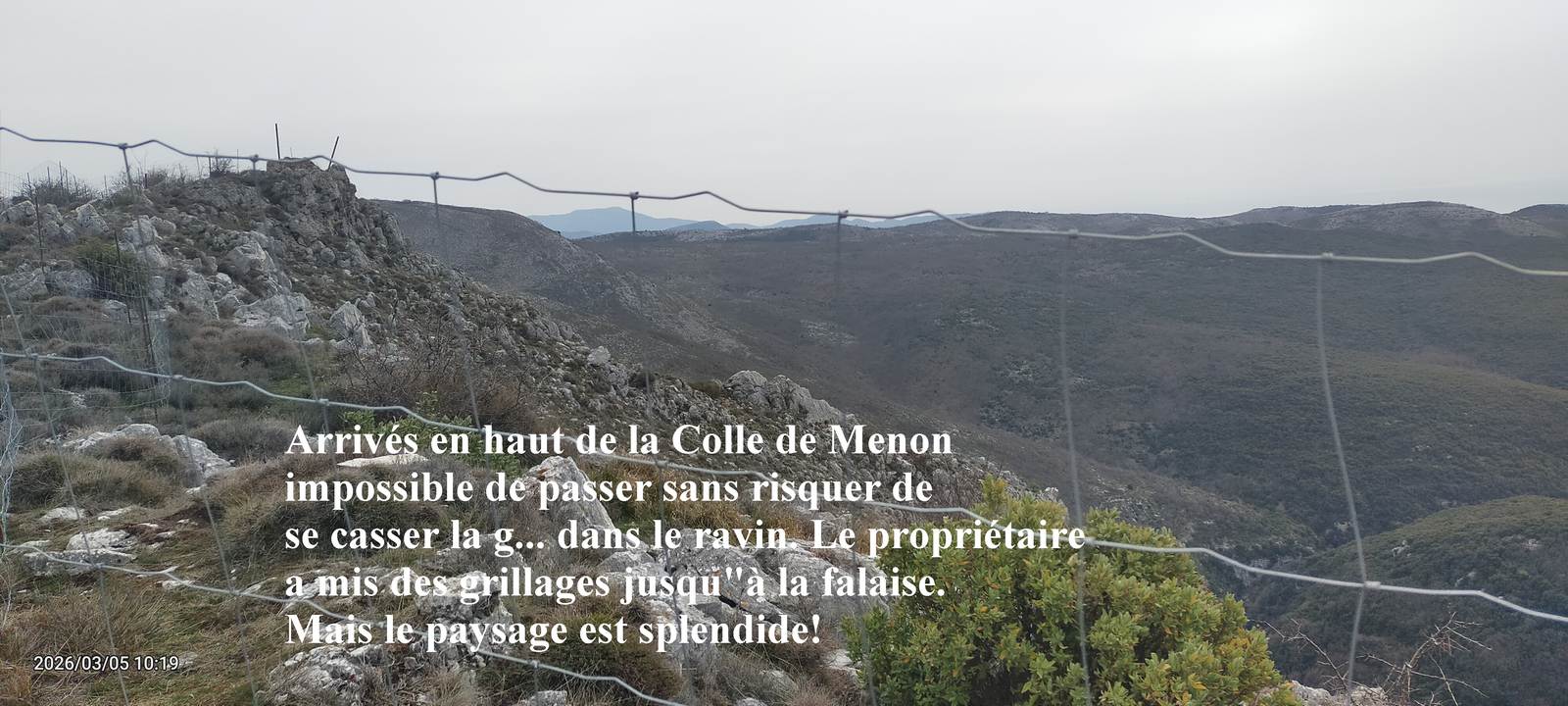 randonneuses(majorité)+randonneurs(minorité)=19 Animateurs : Jean-Luc,Alain Temps : Tiède et nuageux + quelques gouttes d'eau sablonneuse vers la fin Dénivelé : Pas trop! juste bien !! Distance : 11km Départ en douceur. Bifurcation vers la droite direction colle de Menon Rencontre avec le portail fermé d'une Truffière (sic..) entourée de grillages Nous tentons le passage vers la droite pour longer la barrière et la contourner Le proprio qui n'aime vraiment pas les randonneurs a grillagé jusqu'à la falaise avec soin même les 50m qui suffiraient pour redescendre de l'autre côté. Redescente sur la piste du gaz. Petit détour pour redescendre un peu et rendre le dénivelé de la rando raisonnable. Remontée vers le Mouton avec recherche d'abri car le vent est frisquet. Les magnifiques Vautours nous survolent de temps en temps. Retour tranquille par la route du gaz droite comme un i. 7 Vautours rentrent direction la Montagne de Thiey il semble. Belle journée mais on n'a pas bronzé. Jean-Paul Photos Patricia,JP |