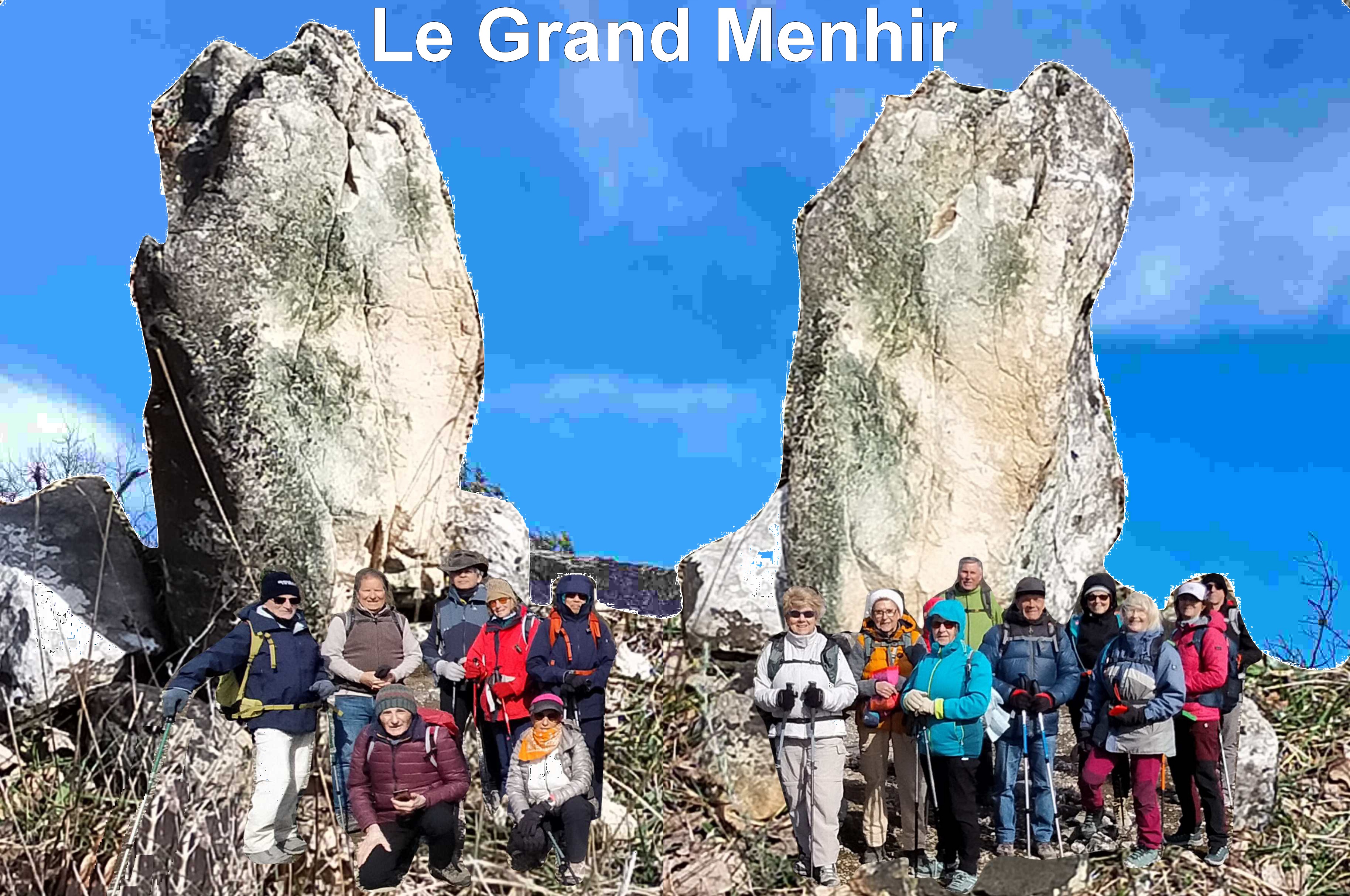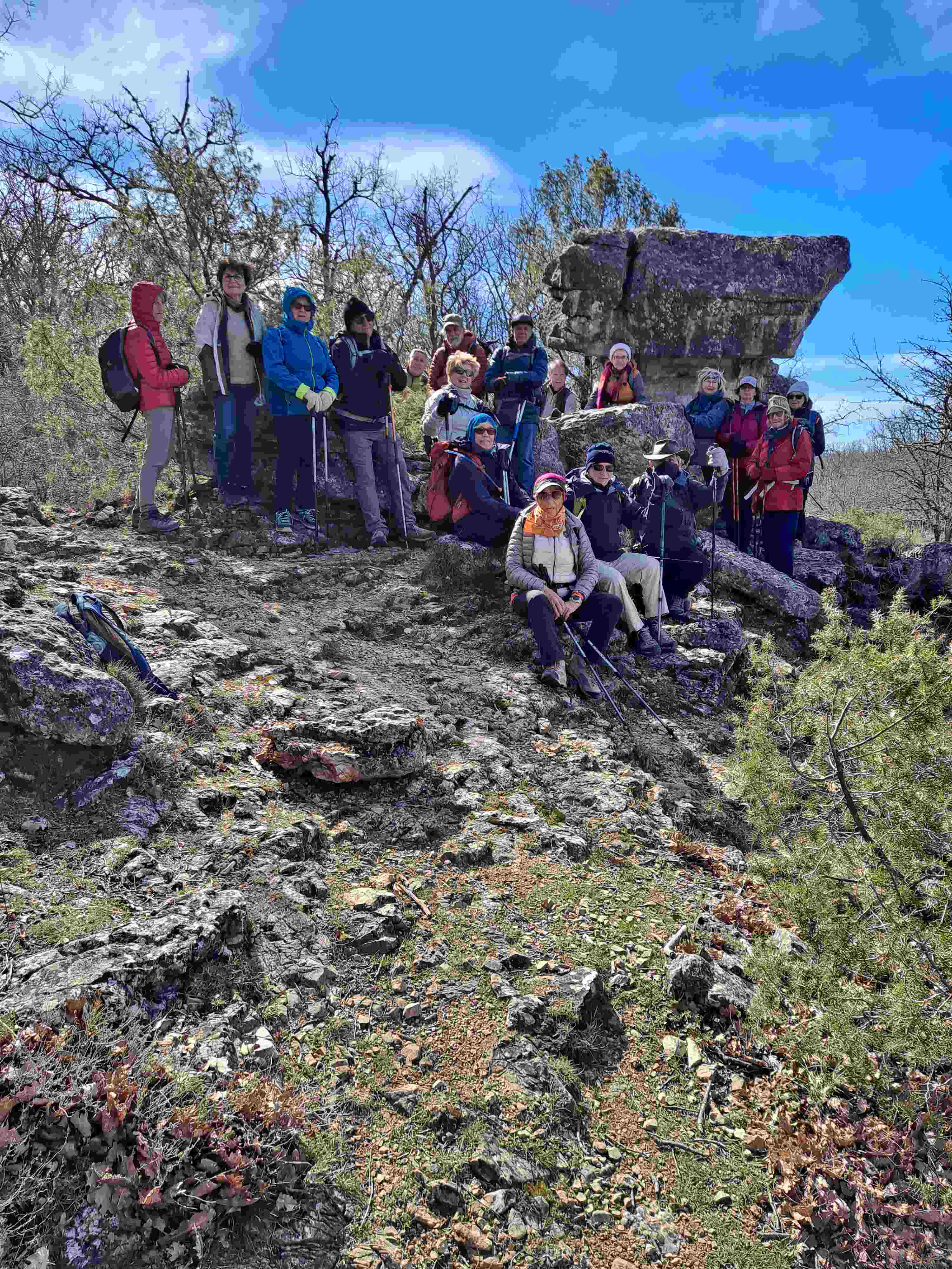 Jeudi 26/03 Croix De Cabris Le fort vent prévu était bien là et le froid associé aussi Du coup 26 participants prévus et ce sont 19 randonneurs qui s'élancent sur un sentier relativement plat à la recherche des pierres druidiques une premiére en forme de table apparait "pas trés naturelle" on cherche la seconde plus grande type "cheminée de fée" à l'abri du vent on profite pour faire l'arrêt banane Les GPS indiquent des "dolmen" et "aven" ("aven de l'air chaud" et "aven de Saint-Joseph") dans la zone pas trouvés..(car dissumulés et souvent maçonnés) C'est pas grave à 19 on imagine une réplique (Voir photos du menhir d'Alain) il nous reste la grimpette vers le sommet de la croix de Cabris et son beau panorama Finalement à l'abri du vent on pique nique sur cette rocaille et c'est "vent dans le nez" que nous fermons la boucle en passant prés d'une borrie bien conservée avec un peu trop de"goudron" pour retrouver les véhicules mais fruits,friandises nous réconfortent aprés un peu plus de 300m de déniv. (un peu plus que prévu...) pour 12,5 km le vent faiblissait un peu et ciel parfaitement bleu. Alain R Un site interessant sur les aven de Saint-Vallier PHOTOS |